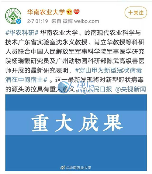 華南農(nóng)業(yè)大學(xué)的沈永義和肖立華對(duì)比了穿山甲和新型冠狀病毒感染者體內(nèi)的基因樣本,并結(jié)合其他研究結(jié)果,發(fā)現(xiàn)穿山甲可能是新型冠狀病毒的潛在來(lái)源。兩位研究人員在2月7日舉行的新聞發(fā)布會(huì)上表示,二者序列之間的相似度高達(dá)99%。